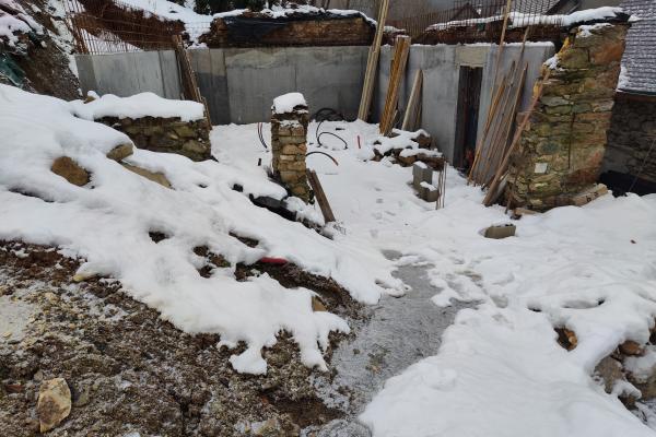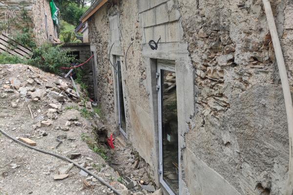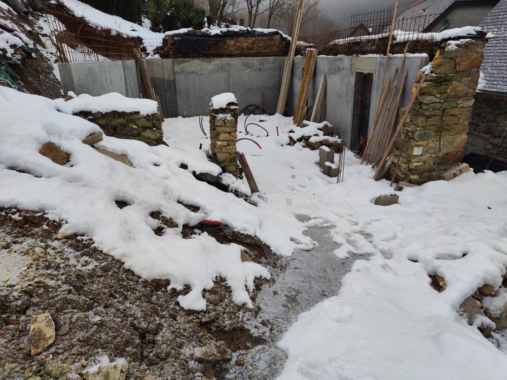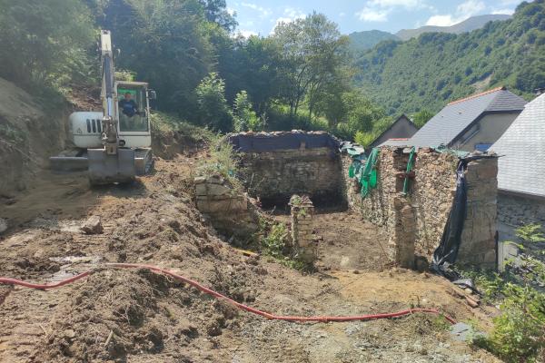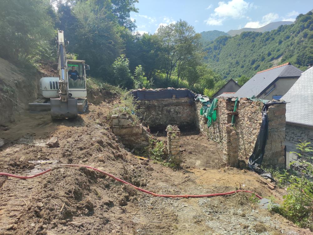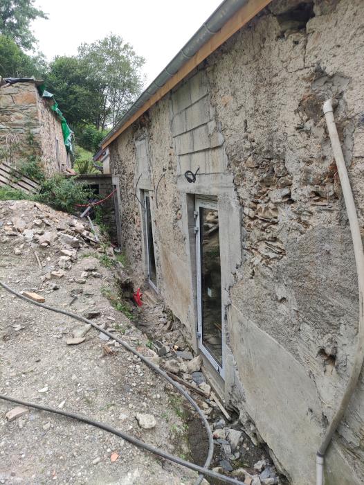 Les travaux ont débuté par une phase de démolition soigneusement maîtrisée, permettant de dégager les volumes intérieurs et d’assainir les structures existantes. Nous avons ensuite procédé à la création de nouvelles ouvertures dans les maçonneries anciennes, afin d’apporter davantage de luminosité et de fonctionnalité au lieu. Des travaux de terrassement ont également été réalisés pour stabiliser les abords et préparer les futurs aménagements.
