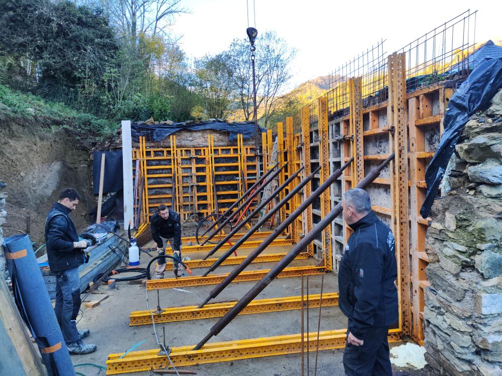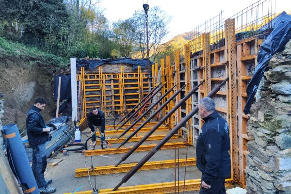 En parallèle, nous avons entrepris la rénovation de la ruine attenante, un défi technique de taille. Afin de conserver le cachet des anciens murs en galets, nous avons coulé des voiles en béton armé accolés à ces maçonneries traditionnelles. Cette combinaison permet de stabiliser l’ensemble tout en préservant l’authenticité du site.